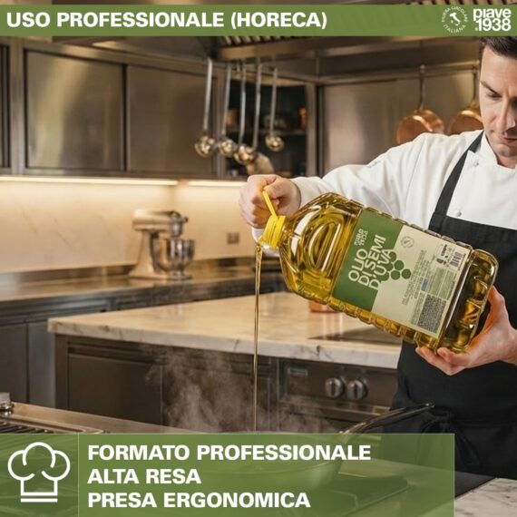 Come olio di vinaccioli per cucinare, è perfetto per soffritti leggeri, cotture al forno, condimenti a crudo e ricette moderne.