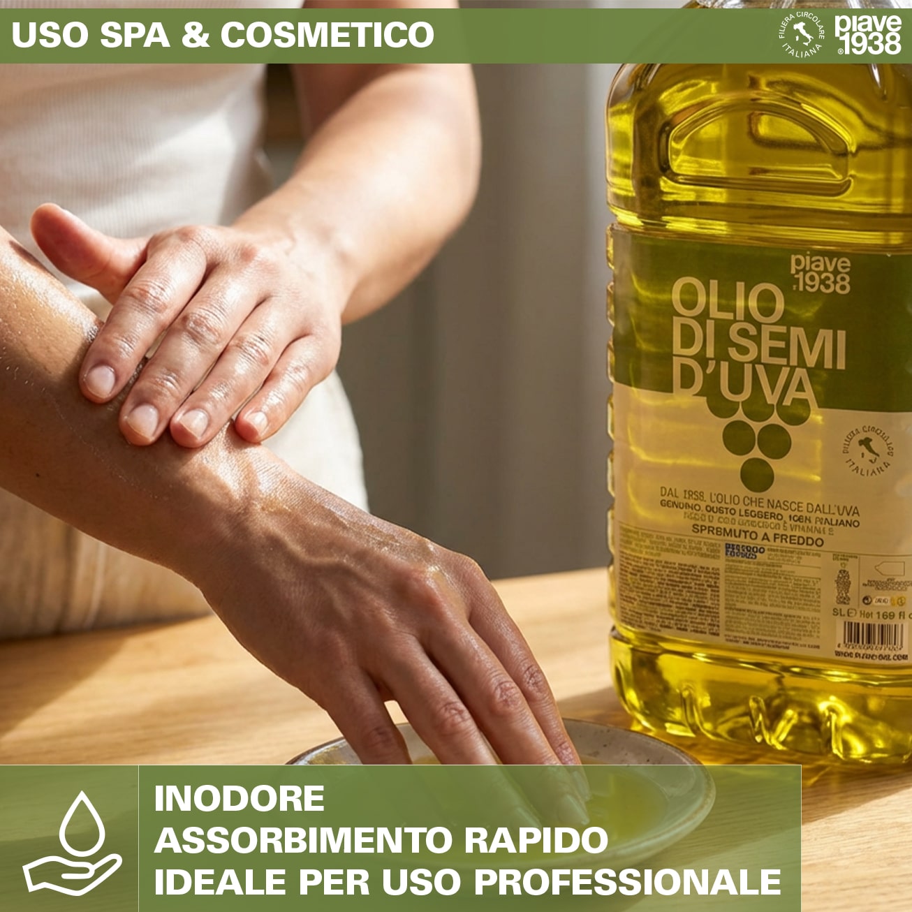 La sua leggerezza e la rapidità di assorbimento lo rendono idoneo per massaggi e applicazioni professionali in centri estetici e SPA.